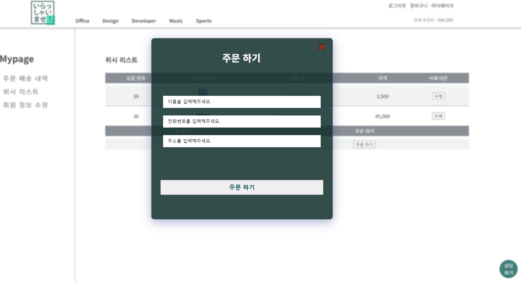 모달창으로 주문정보를 입력하실 수 있습니다