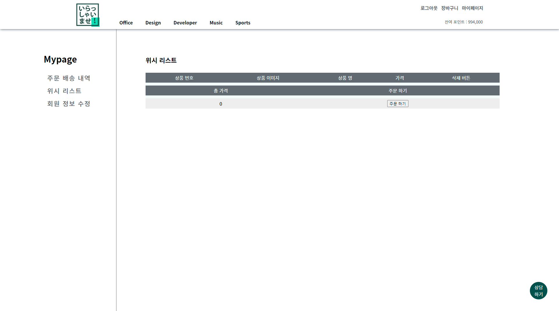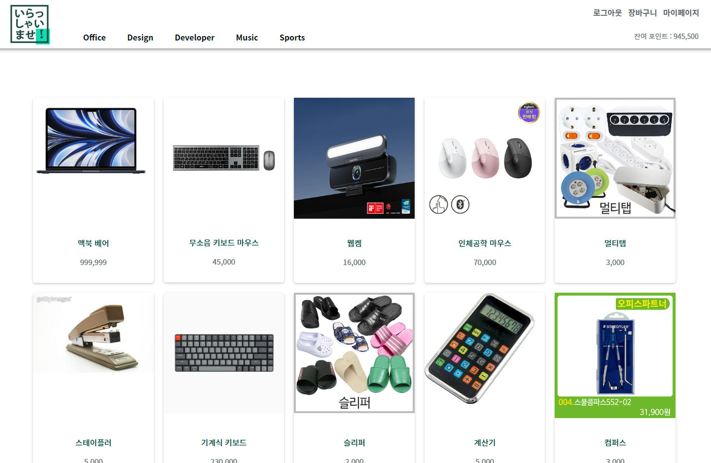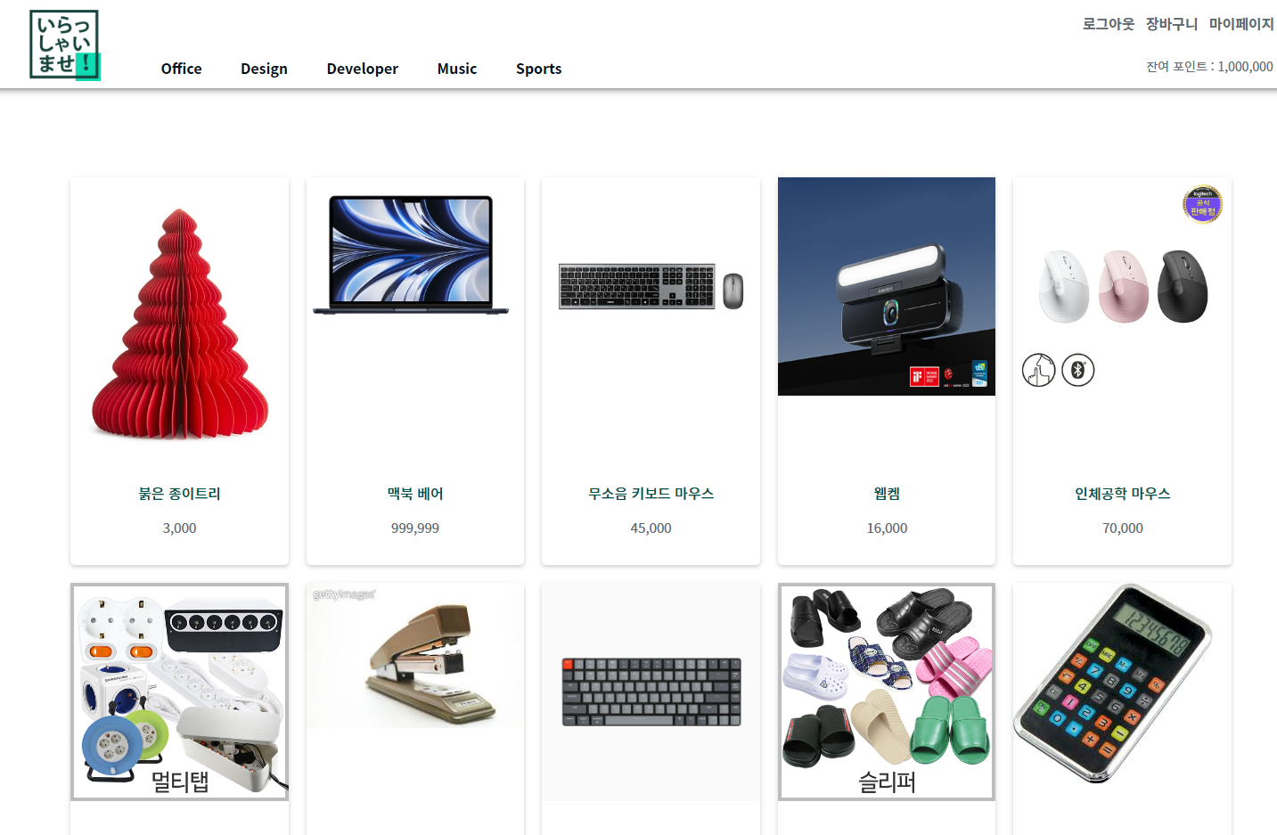 각각 로그아웃, 장바구니 마이페이지, 그리고 약간 하단에 잔여 포인트 1000000원이 있습니다