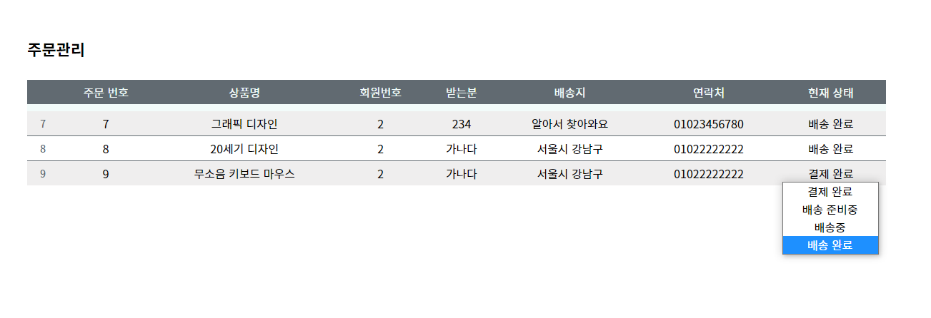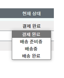 주문관리 : 주문관리 테이블 안에 있는 각각의 현재상태를 클릭하면 셀렉트 박스로 주문상태