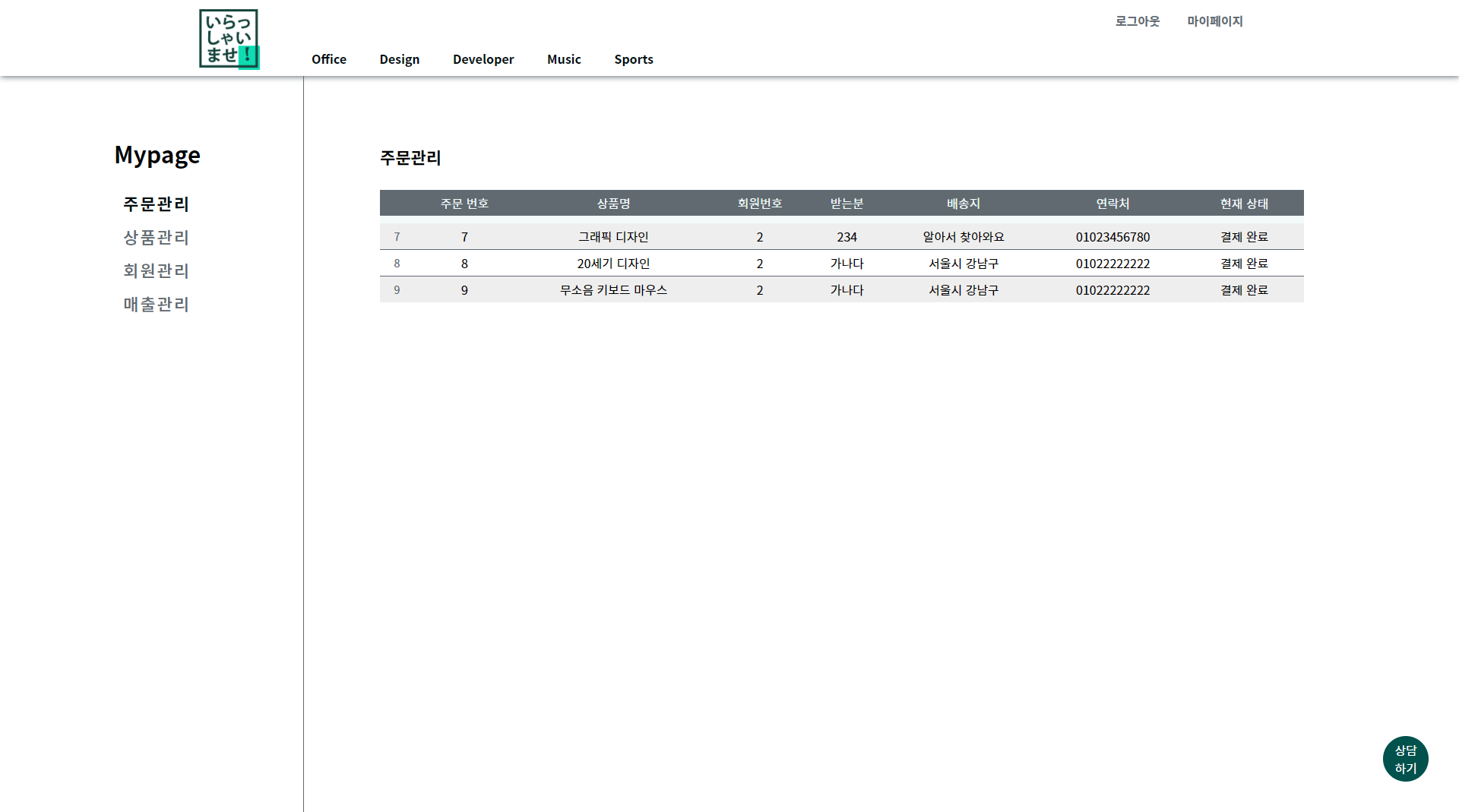 로그인 성공후 관리자 마이페이지로 진입하게 됩니다