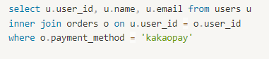 ex: select * from orders where payment_method = "kakaopay" limit 5;