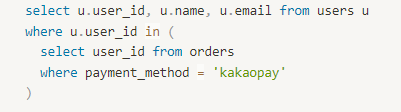 ex: orders 테이블에서 결제수단이 카카오페이인 데이터만 가져와
